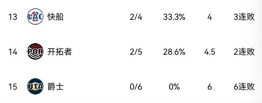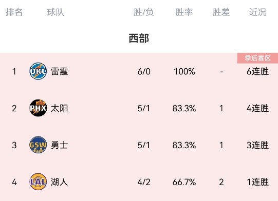 目前,太陽5勝1負西部第二,勇士5勝1負西部第三,湖人4勝2負西部第四,快船2勝4負西部倒數第三。