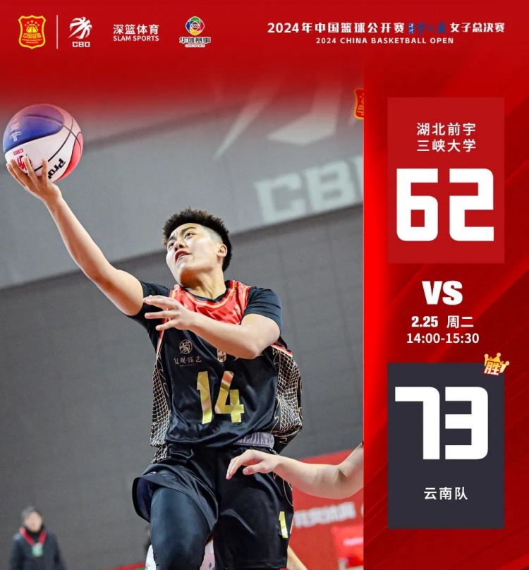 首場(chǎng)比賽由湖北前宇三峽大學(xué)對(duì)陣云南隊(duì),上半場(chǎng)開局,兩隊(duì)打得相對(duì)膠著,比分緊咬至6平。隨后湖北前宇三峽大學(xué)加強(qiáng)防守,8號(hào)漆采籃下強(qiáng)勢(shì),反擊中4號(hào)衛(wèi)香羽、5號(hào)陸婷接連籃下得分,湖北前宇三峽大學(xué)16-9領(lǐng)先。落后的云南隊(duì),不斷通過外線尋找機(jī)會(huì),14號(hào)娜漢三分命中,幫助球隊(duì)逐漸追平并反超比分。首節(jié)結(jié)束,云南隊(duì)22-20領(lǐng)先湖北前宇三峽大學(xué)。次節(jié),兩隊(duì)進(jìn)攻火力不減,湖北前宇三峽大學(xué)5號(hào)陸婷依舊手感火熱,云南隊(duì)14號(hào)娜漢也不甘示弱。半場(chǎng)結(jié)束,云南隊(duì)39-37領(lǐng)先湖北前宇三峽大學(xué)。下半場(chǎng),隨著體力的下降,兩隊(duì)進(jìn)攻成功率都所有降低,湖北前宇三峽大學(xué)陷入短暫的得分荒,反觀云南隊(duì)在14號(hào)娜漢、6號(hào)羅菲的帶領(lǐng)下,多次反擊快攻得手,最終云南隊(duì)73-62戰(zhàn)勝湖北前宇三峽大學(xué)。