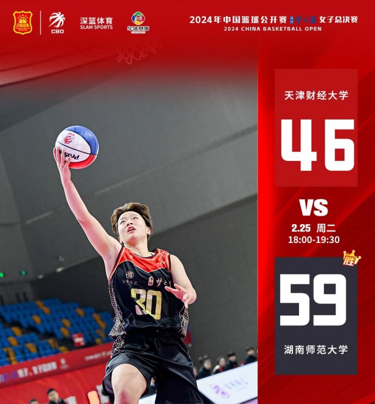 第三場(chǎng)比賽由天津財(cái)經(jīng)大學(xué)對(duì)陣湖南師范大學(xué),上半場(chǎng)比賽開始,兩隊(duì)便火藥粉十足,均表現(xiàn)出了強(qiáng)大的防守能力,首節(jié)天津財(cái)經(jīng)大學(xué)14-15湖南師范大學(xué)。次節(jié),天津財(cái)經(jīng)大學(xué)全員手感不佳,湖南師范大學(xué)趁勢(shì)打出一波得分的小高潮。半場(chǎng)結(jié)束,湖南師范大學(xué)38-22領(lǐng)先天津財(cái)經(jīng)大學(xué)。下半場(chǎng),天津財(cái)經(jīng)大學(xué)及時(shí)調(diào)整,奮起直追。8號(hào)夏榮三分命中,天津財(cái)經(jīng)大學(xué)追至34-44,湖南師范大學(xué)穩(wěn)扎穩(wěn)打,最終湖南師范大學(xué)59-46戰(zhàn)勝天津財(cái)經(jīng)大學(xué)。