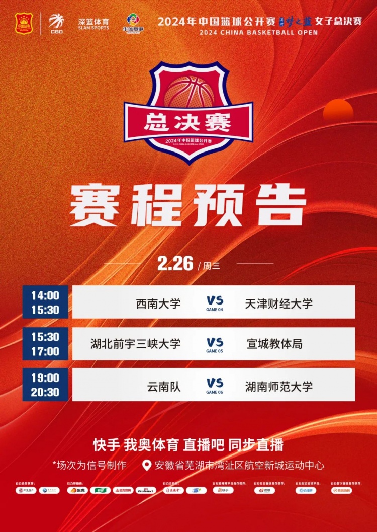 2月25日,2024年中國籃球公開賽洋河夢(mèng)之藍(lán)女子總決賽在安徽省蕪湖市灣沚區(qū)航空新城運(yùn)動(dòng)中心打響。在首輪進(jìn)行的三場(chǎng)比賽中,云南隊(duì)、西南大學(xué)、湖南師范大學(xué)取得開門紅。