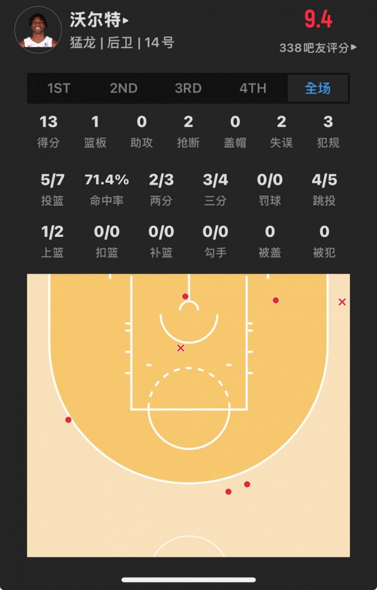 猛龍19號(hào)秀 賈科比-沃爾特 登場(chǎng)29.1分鐘