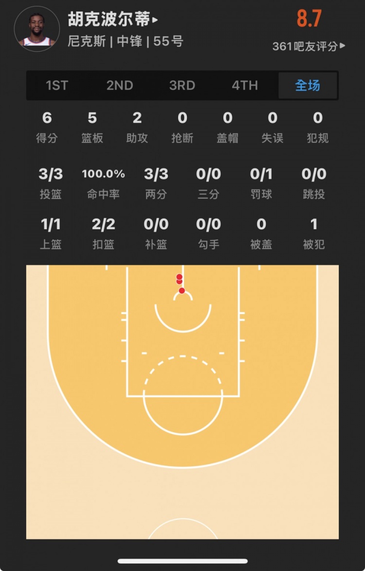 尼克斯58號(hào)秀 阿里埃爾-胡克波爾蒂 登場(chǎng)18.9分鐘