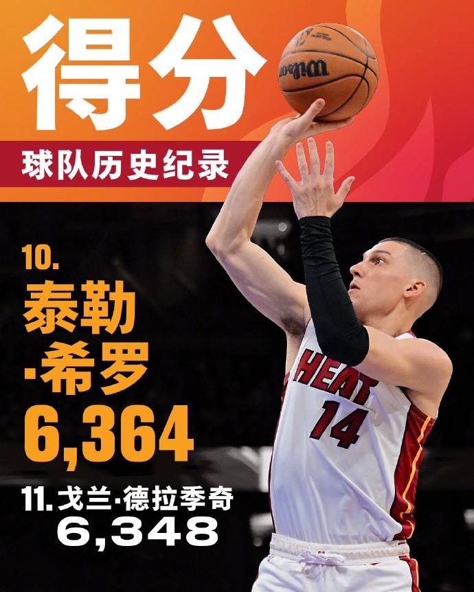 至此,希羅生涯總得分來(lái)到了6364分,超越了戈蘭-德拉季奇,升至熱火隊(duì)史第十,將追趕哈斯勒姆(6586分)。
