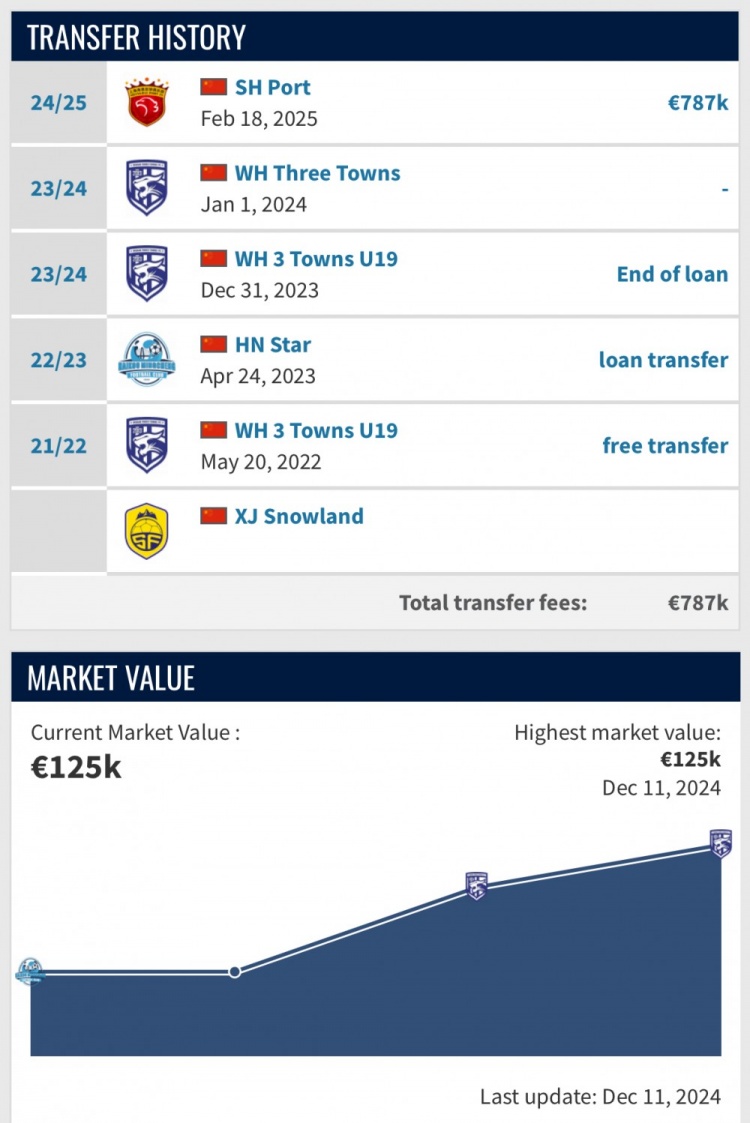 在吾米提江的個人頁面顯示,他已于2月18日加盟上海海港,轉會費78.7萬歐元(約合600萬人民幣),不過合同年限暫未披露。目前,吾米提江的個人身價為12.5萬歐元。