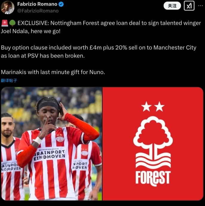 羅馬諾在社媒寫道:“獨(dú)家消息:諾丁漢森林同意以租借方式簽下天才邊路球員喬爾-恩達(dá)拉,HWG!由于曼城和埃因霍溫就球員租借的相關(guān)事項已經(jīng)破裂,諾丁漢森林從中介入,據(jù)悉租借合同中將附帶400萬鎊+20%未來轉(zhuǎn)會分成的買斷條款?!?/p>