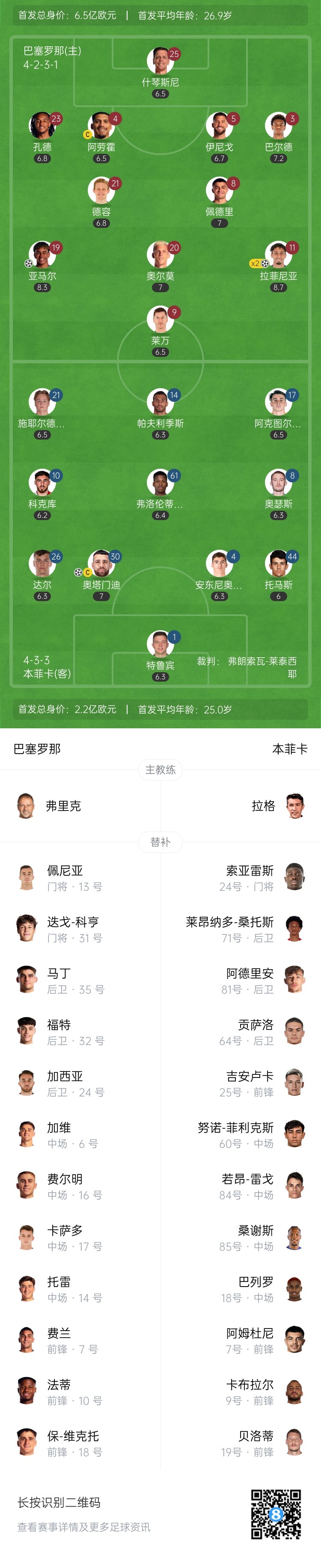 3月12日訊 北京時(shí)間1:45,歐冠1/8決賽次回合巴塞羅那主場迎戰(zhàn)本菲卡,首回合巴薩1-0占得先機(jī)。比賽在奧林匹克球場打響!上半場,亞馬爾助攻拉菲尼亞破門;奧塔門迪很快扳平;隨后亞馬爾左腳禁區(qū)外兜射破門!巴爾德反擊助攻拉菲尼亞完成雙響!半場結(jié)束,巴薩暫3-1領(lǐng)先本菲卡,總比分4-1!