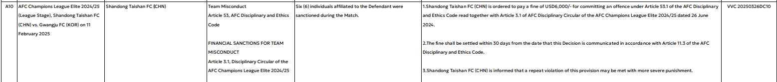 03月28日訊 亞足聯(lián)官方發(fā)布處罰公告,山東泰山因在2月11日亞冠3-1光州FC的比賽中6人染黃,被罰6000美元。