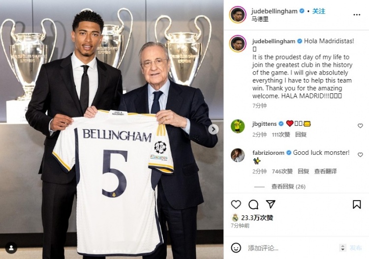 2023年夏天,貝林厄姆加盟皇馬,穿上了偶像齊達內在皇馬穿過的五號球衣。那一天,接受采訪的貝林厄姆非常激動地說,齊達內是他的偶像,能夠在皇馬和偶像穿同樣號碼的球衣,他非常感動,希望自己能夠成為皇馬新五號。